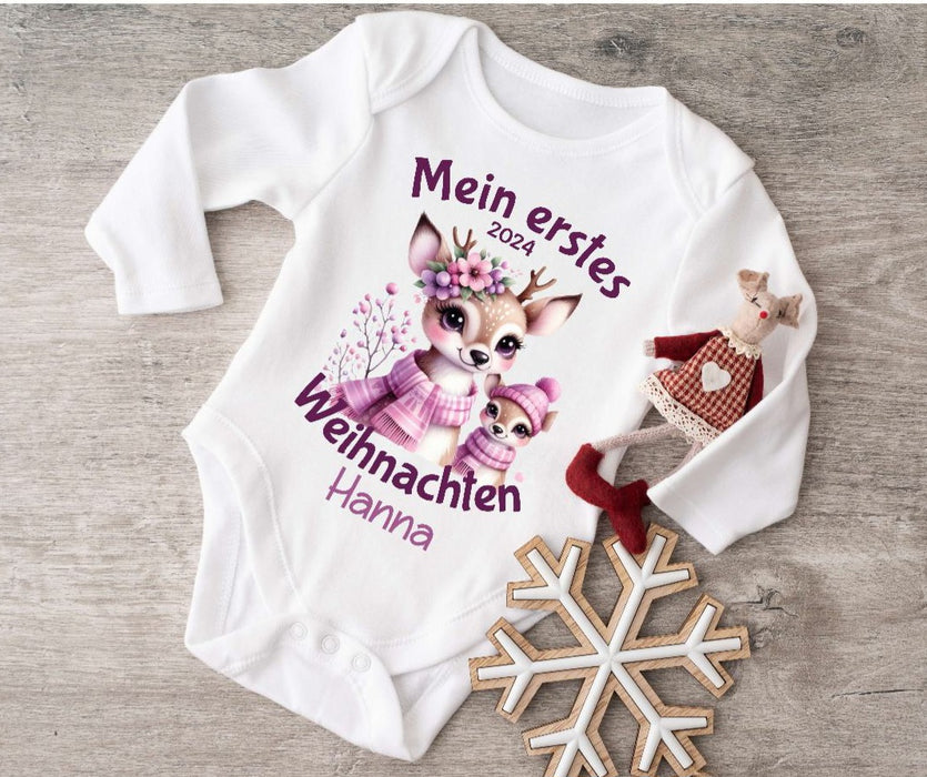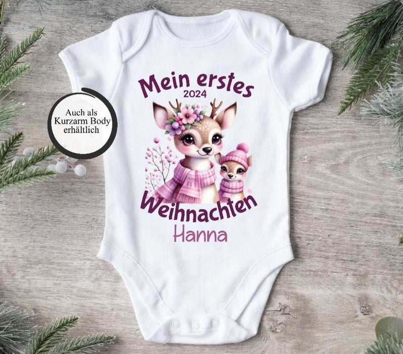Mein erstes Weihnachten Baby Outfit Body Reh Mädchen Babybody Langarm oder Kurzarm