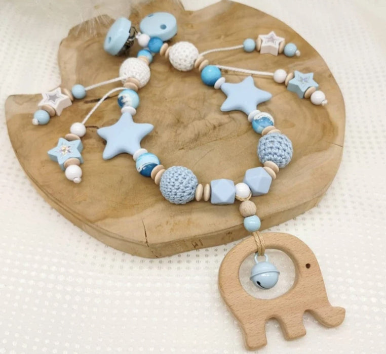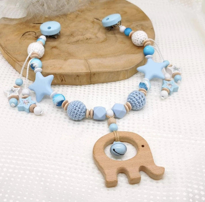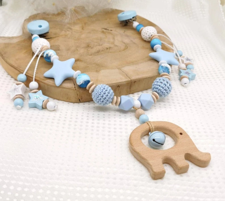 Kinderwagenkette Babyblau & Beige mit Naturholz