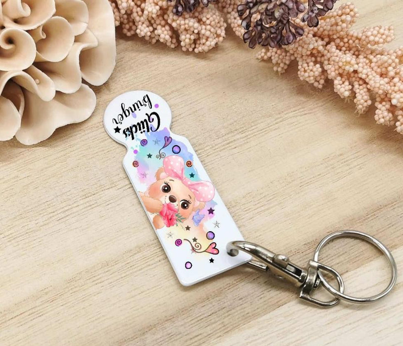 Im Lieferumfang ist, auf Wunsch,  der Karabiner samt Schlüsselring, somit kannst du den Schlüsselring kinderleicht an deinem Schlüsselbund