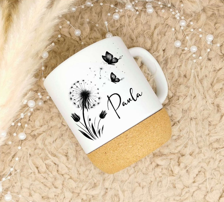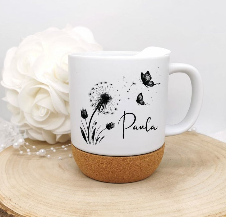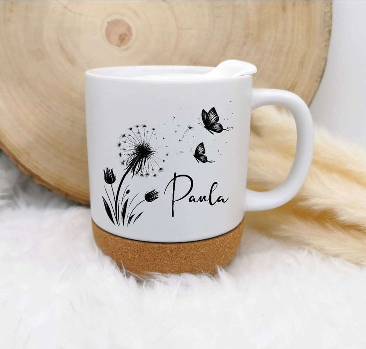 Personalisierte Tasse to go Pusteblume mit Korkboden und Deckel Keramik Geschenkidee
