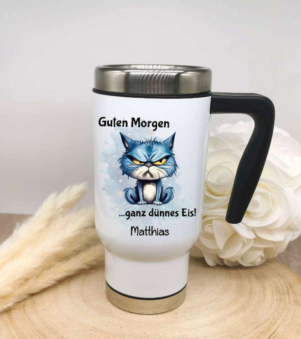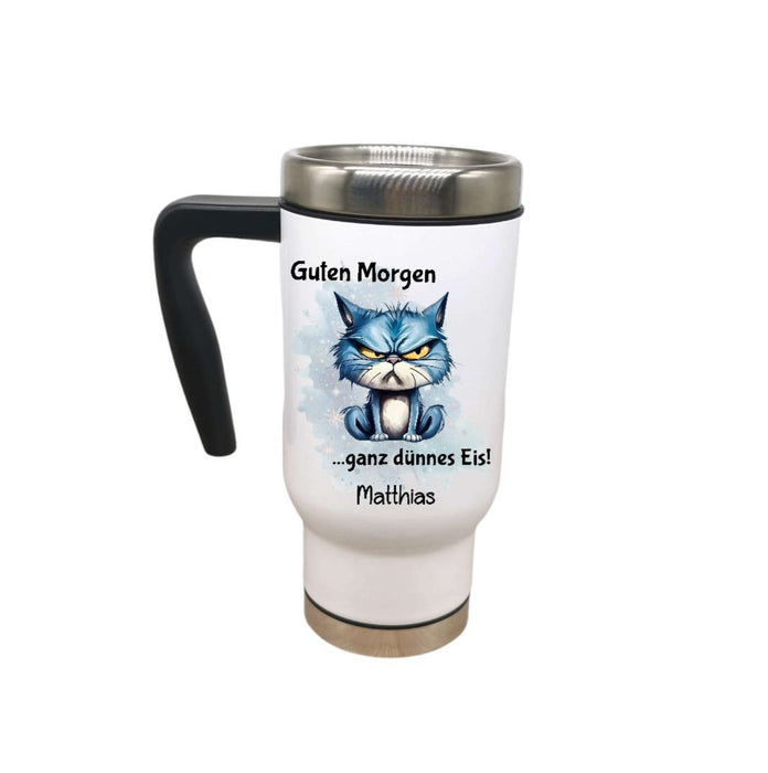 Thermobecher personalisiert Guten Morgen Lustig Witzig Cup Becher mit Namen Edelstahl mit Griff Geschenk Kaffeebecher Auto Reisebecher isoliert