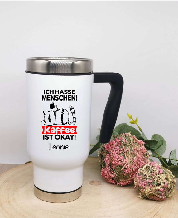 Thermobecher personalisiert Ich hasse Menschen Lustig Witzig  Cup Becher mit Namen Edelstahl mit Griff Geschenk Kaffeebecher Auto Reisebecher isoliert
