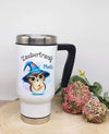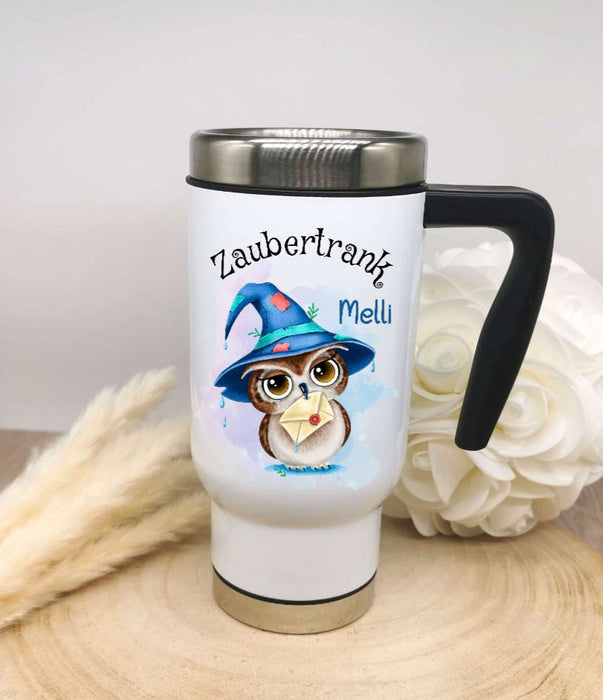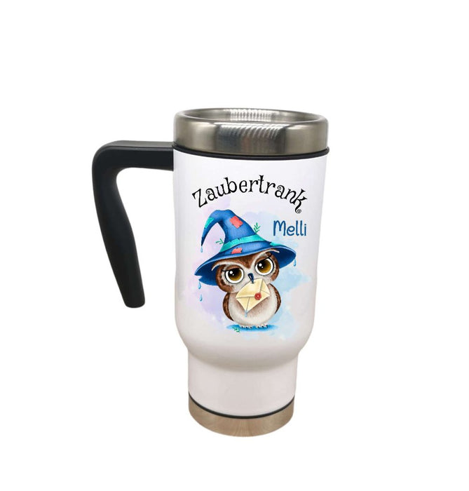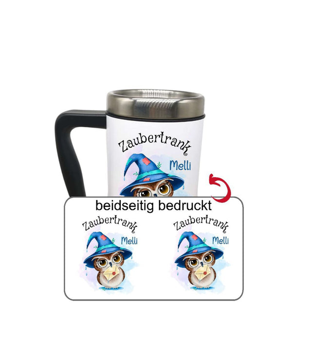 Thermobecher personalisiert Eule Zaubertrank Cup Becher mit Namen Edelstahl mit Griff Geschenk Kaffeebecher Auto Reisebecher isoliert