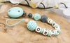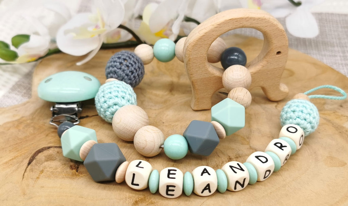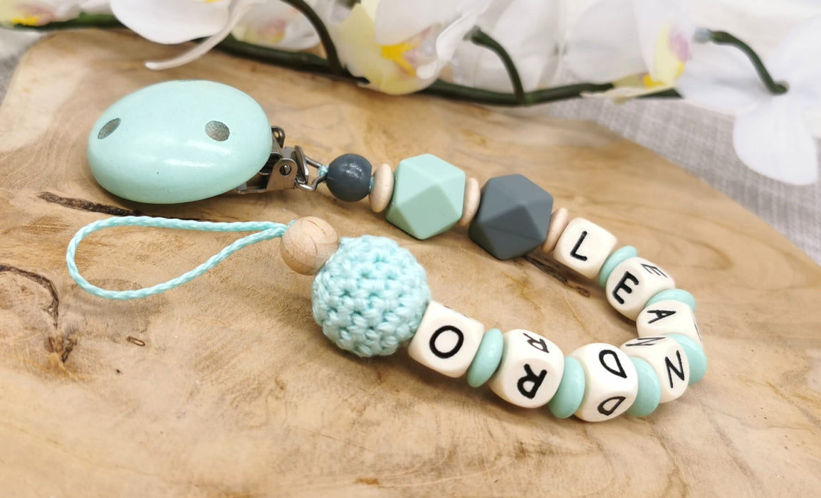 Set Greifling & Schnullerkette mit Name Junge Mädchen Mintgrün
