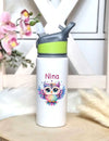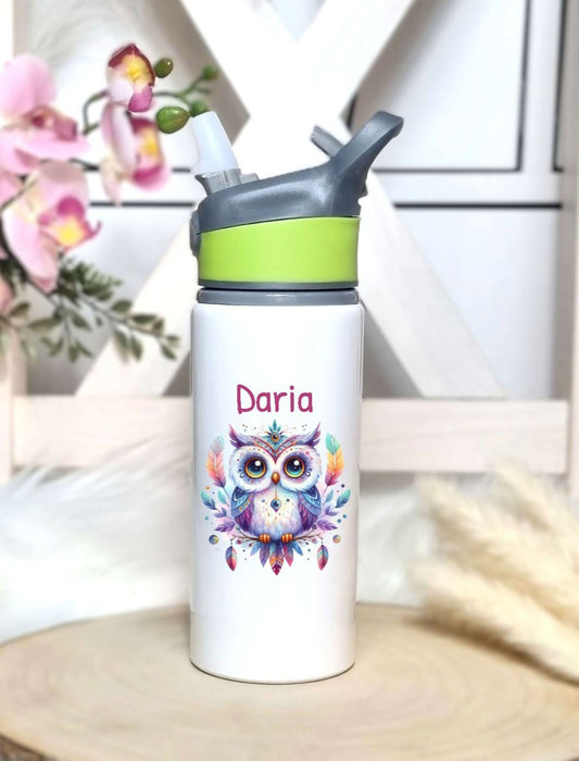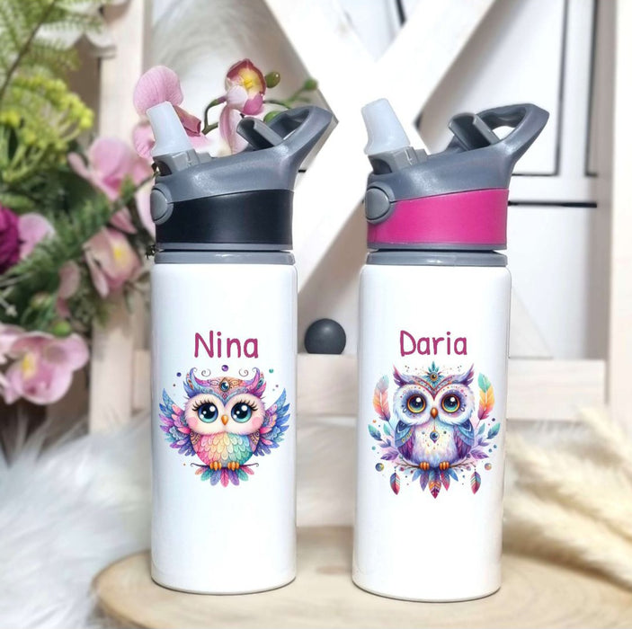 Personalisierte Trinkflasche mit Namen und Strohhalm Eule Wasserflasche aufklappbares Mundstück