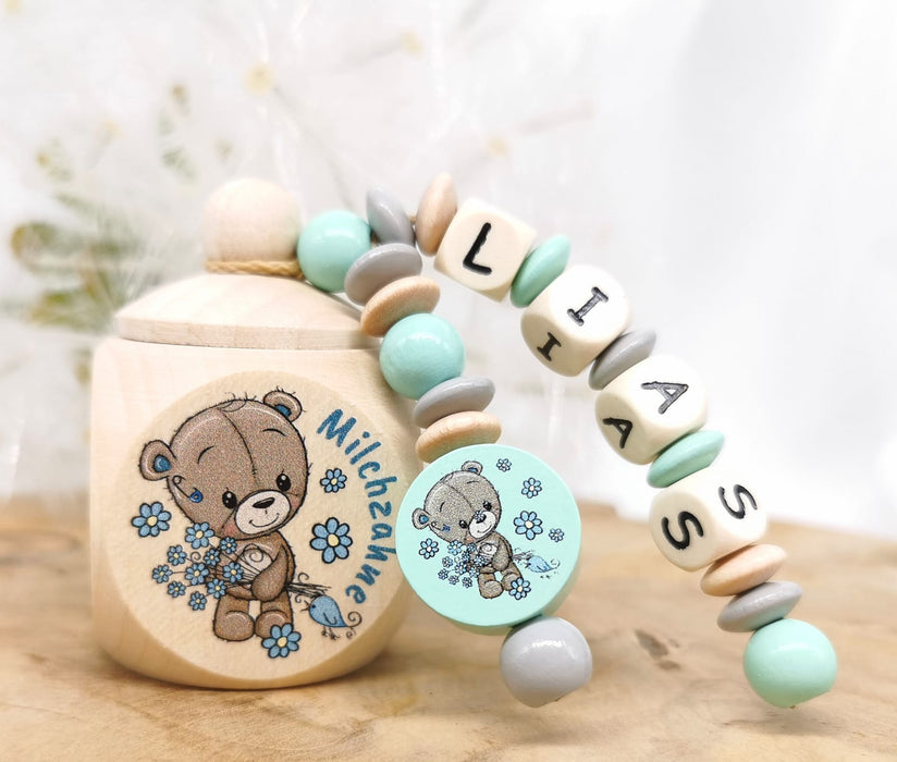 Bei dieser hübschen Zahndose kommt die Zahnfee sicher gerne vorbei und lässt eine extra große Überraschung unter dem Kissen da. Zusammen mit dem Namensanhänger hast Du eine schöne Aufbewahrungsmöglichkeit für die ersten Milchzähne.
