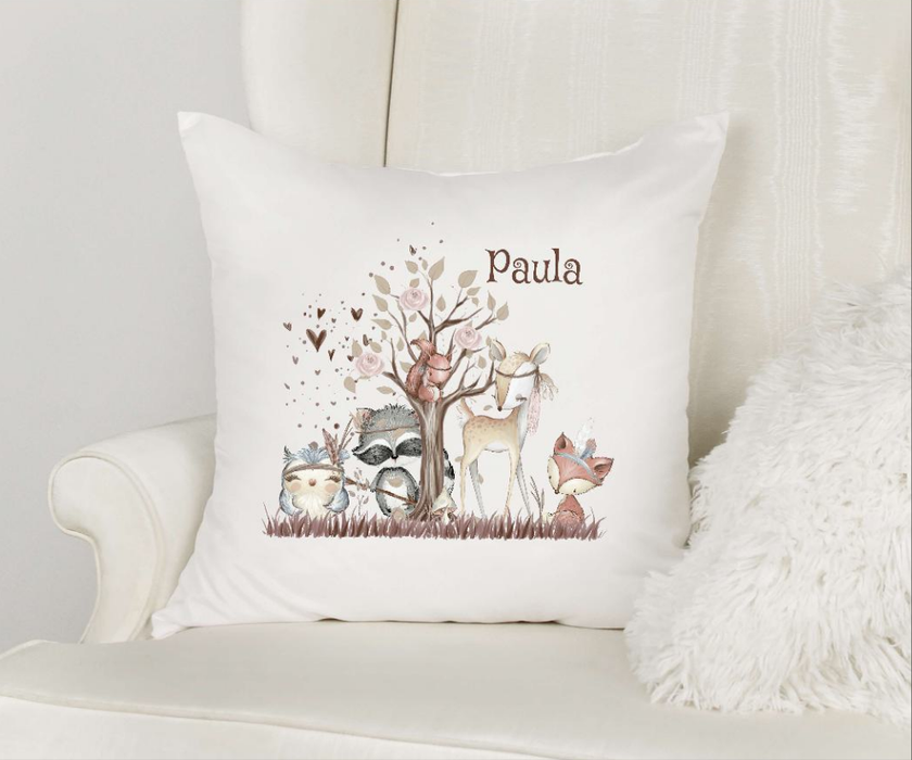 Personalisiertes Kissen Waldtiere Reh Fuchs Eichhörnchen Waschbär Kinderkissen Kissenhülle Kissenbezug mit Reißverschluss 40x40cm