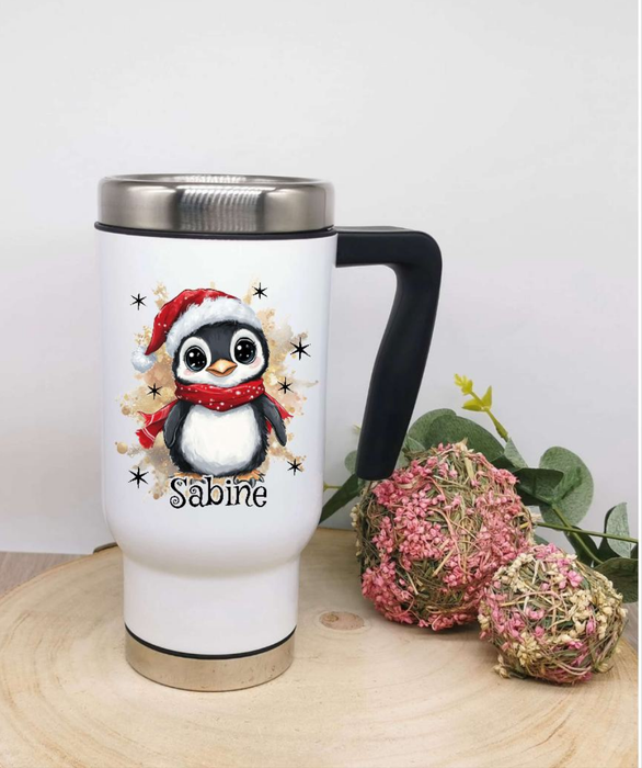 Thermobecher personalisiert Pinguin Cup Becher mit Namen Edelstahl mit Griff Geschenk Kaffeebecher Auto Reisebecher isoliert