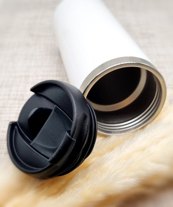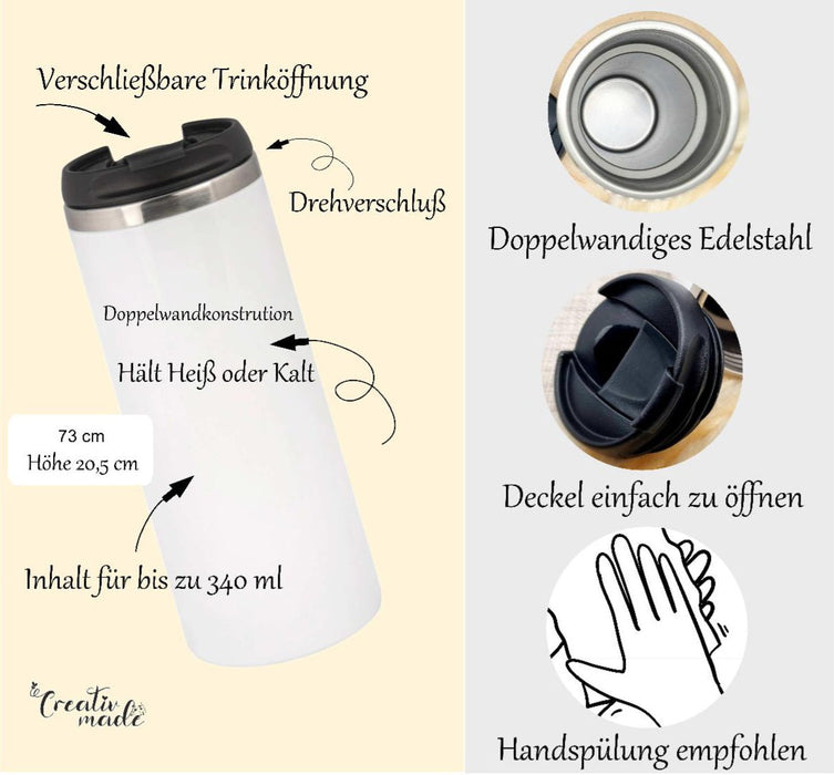 Einen formschöen Trinkbecher personlisiert mit Namen. Durch die Doppelwandfunktion bleibt heißes lange heiß und kaltes lange kalt. Der Deckel ist ergonomisch geformt und hat eine verschließbare Trinköffnung.